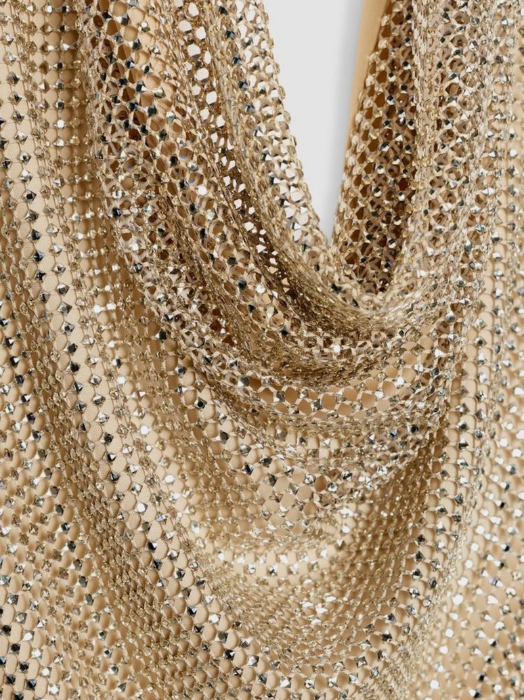 A bold halter-neck mini dress in radiant gold, designed with a fluid drape and sheer mesh trim for added allure. A standout piece that shines with every step.